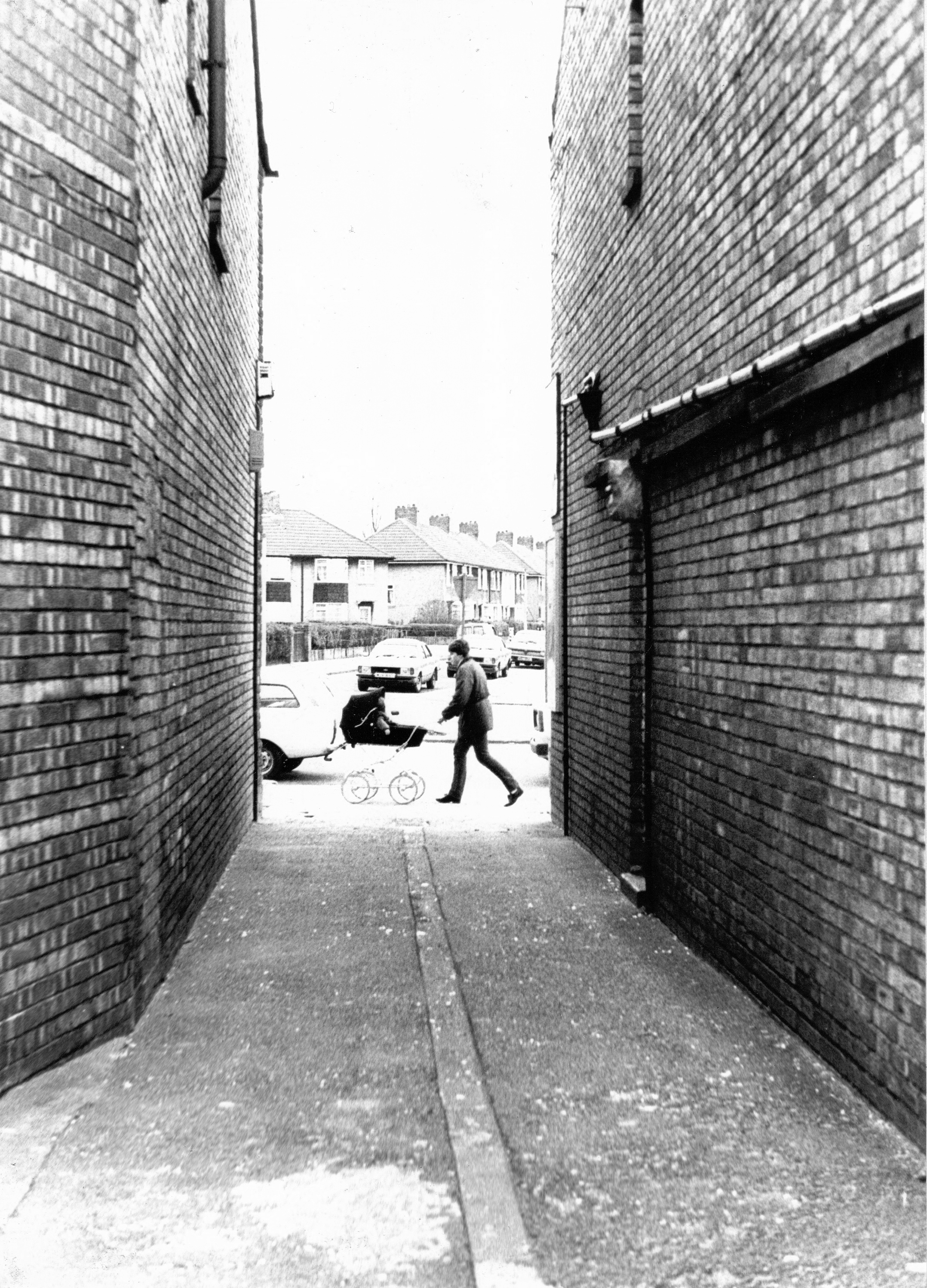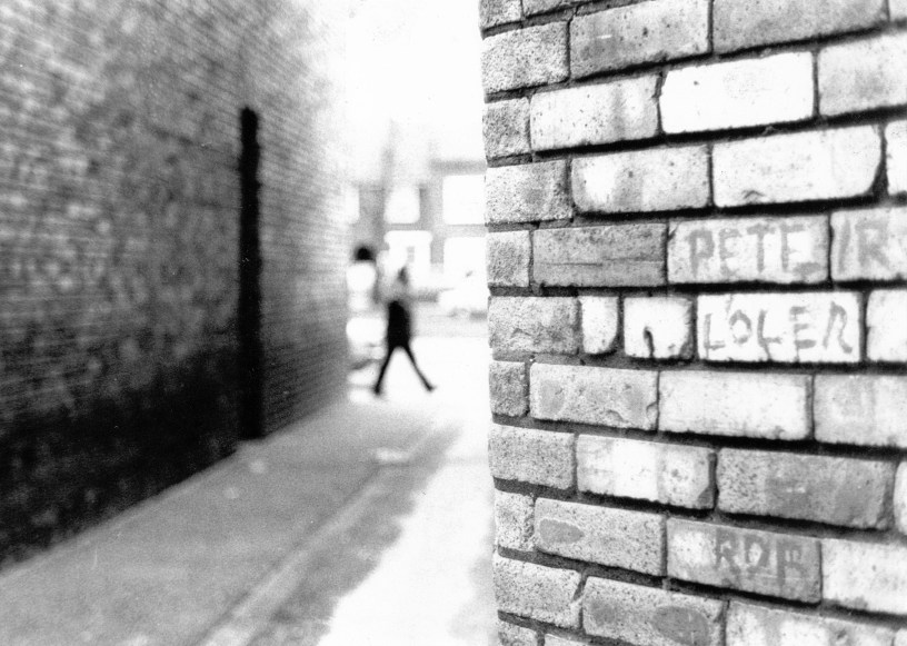I think these pictures were taken near North East Liverpool Technical College. I was meeting a friend there and had some time to spare… In image 1 there’s the familiar split-frame style with the drop off in focus on the left. I like the shape of the figure, there’s a sense of mystery to this photograph, almost like someone is being followed.