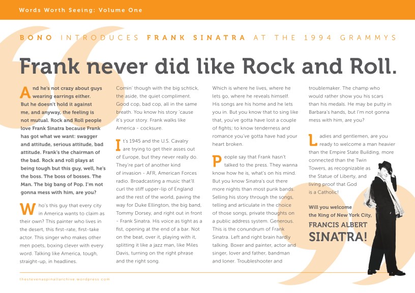 It was presented to him by U2’s Bono, who introduced Sinatra with a speech that was both witty and eloquent. Some found it controversial but I admired Bono’s words and still think it’s one of the best things he’s ever written. I’ve always thought it would make an interesting typographical poster.