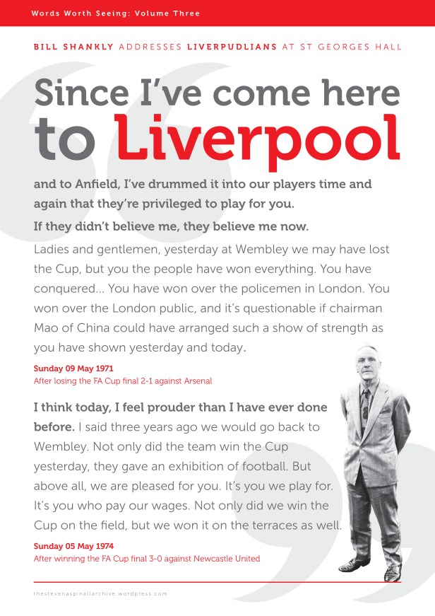 Bill Shankly was manager of Liverpool FC from 1959 to 1974. He is widely credited with taking the club from second division obscurity to the pinnacle of European football and had a wonderful way with words. I have used extracts from two of his speeches given after cup finals. I love the way he connects with Liverpool people.