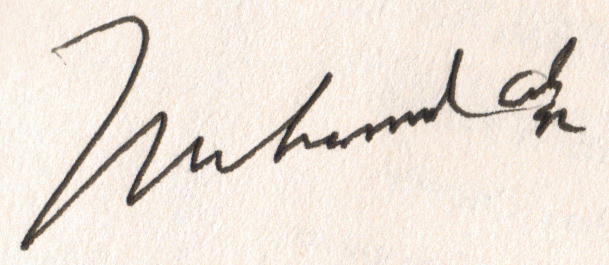 Presently I arrived at the head of the queue and found myself standing in front of the most famous boxer in history. My first impression was that despite his problems, at fifty years of age Ali still looked good. Clear skinned and smart in white shirt and dark tie.