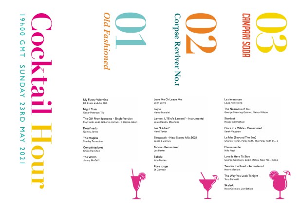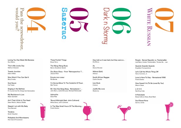 Simply put, music to drink cocktails to. Members were asked to name their playlist after a favourite cocktail, and to imagine what would be playing if they found themselves sipping it on some glamourous terrace with the sun setting gently over a calm sea.