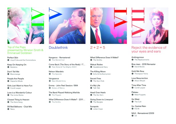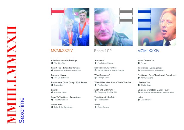 The music of the year 1984. Which, upon investigation, slightly surprised us all by being quite a good 12 months for records. I enjoyed researching imagery of the time and chose to focus on newsworthy people and events that wouldn’t normally spring to mind. Note, I got the roman numerals wrong – it should be XXIII not MMIII, which is actually 2003 not 23.
