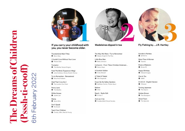 We were asked to choose songs and tunes that resonated with the memories and sounds of our early youth. This was probably one of our most personal sessions. There was a lot of misty-eyed reminiscing and some quite lovely and moving stories from people’s childhoods. The Psssh-ti-cooof phrase in the title is the noise Ivor the Engine makes as voiced by Oliver Postgate. It is used in the playlist interstitials.