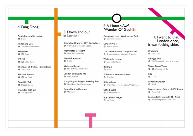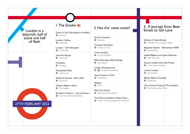The title is from Peter Ackroyd’s 2000 book London: The Biography. All tunes had to have a relevance or association to London – in the title or mentioned in the lyrics. It’s towns and boroughs, it’s rivers and canals, streets, roads and thoroughfares, etc. The tube map pastiche felt a bit route one but I couldn’t resist it.