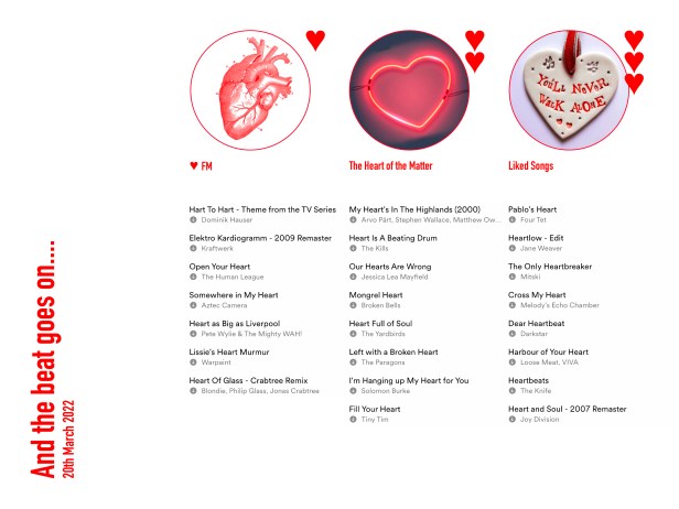 Heart(s) and all things connected. Stopped, broken, beating, attacked, loving, aching, forgiving, blackened, cheating fluttering, murmuring, grieving. With a licence to use our imagination if needed. A lot of popular music to draw from here.