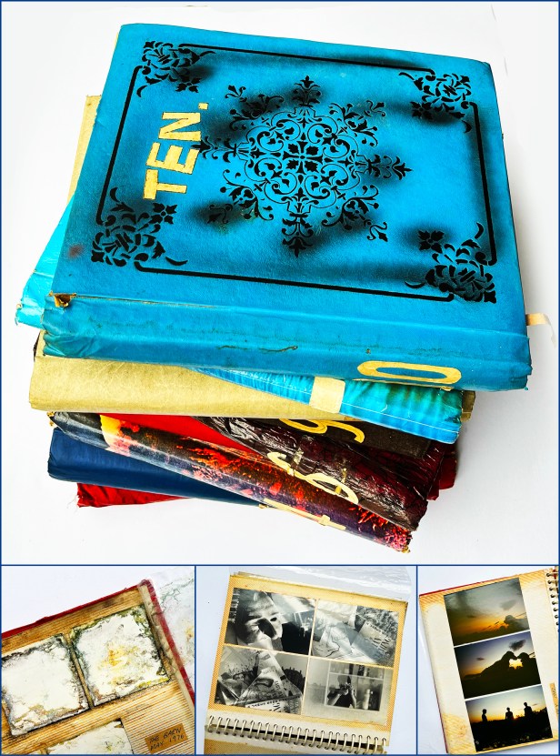 From the mid 70s onwards I filled quite a few photo albums. Bought From Woolworths. The type whose pages have plastic sheets which you peel back and stick the prints underneath. I once stored them in the garden shed of our old house in Crouch End. I never realised that the shed leaked. Some of the albums became drenched with rainwater. Eerily, this caused the images on some of the prints to be literally washed away. Holiday snaps, day trips, special occasions, arty compositions – all scrubbed out. Despite all this I still keep them. I just can’t let them go.