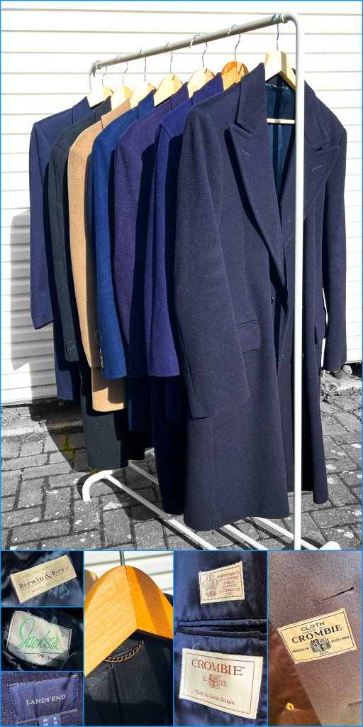 In the Summer months I keep them in special garment covers neatly hung on a clothes rail. I’m thinking of leaving an instruction in my will for them to be redistributed among the charity shops of Muswell Hill. I love the idea of some future scholars benefitting from my extensive and dearly loved Oxfam Overcoat collection.